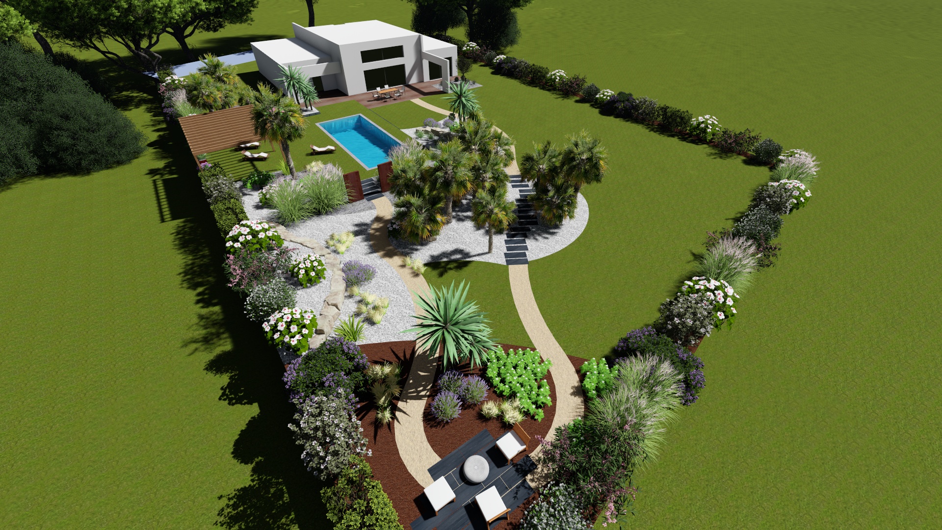 Tout un décor permettant de penser le jardin comme une pièce à vivre supplémentaire de la maison !